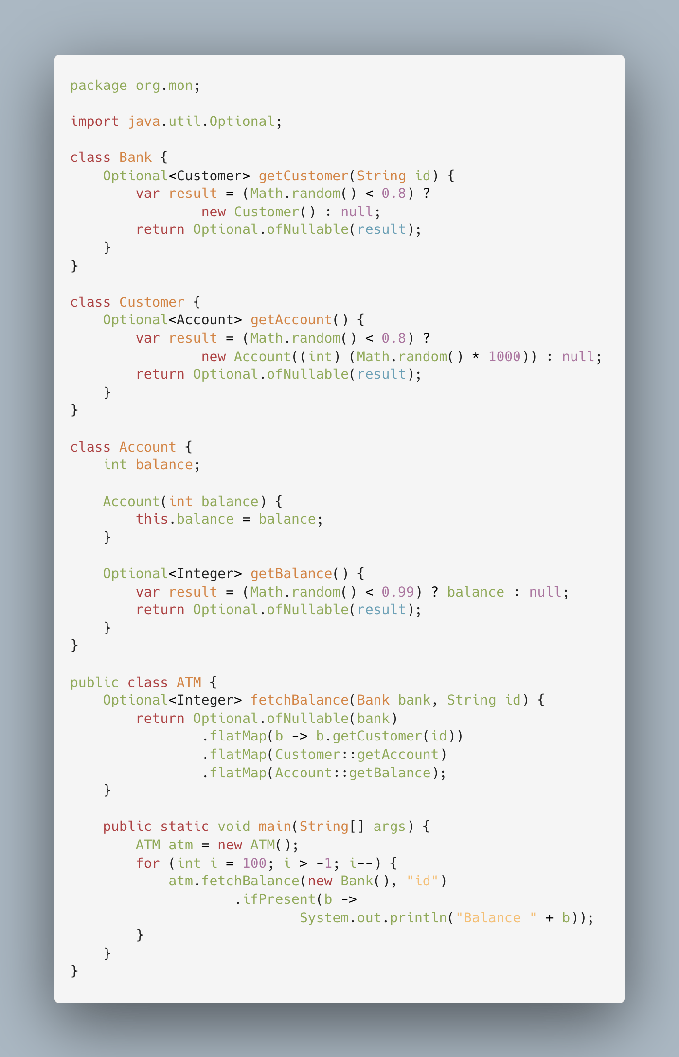 Then, we refactor the ATM's fetchBalance method. First, we wrap the Bank input parameter in the Optional monad. Finally, we use a chain of flatMap calls to perform operations on the wrapped value. Each time calling a getter method to replace the value inside the Optional with a new value. If at any time the value becomes null, any remaining transformations have no effect.