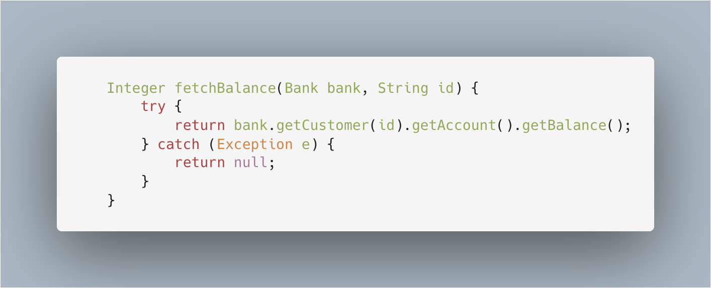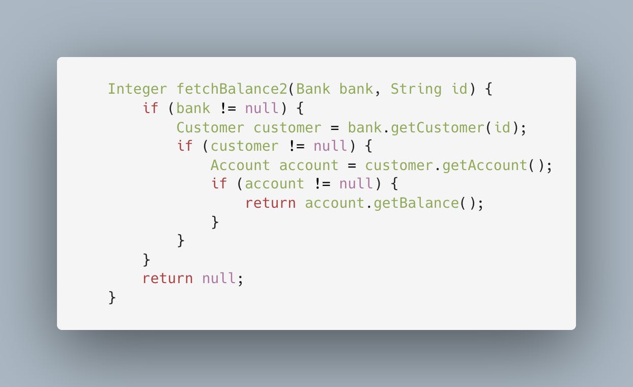 We can fix this by refactoring the fetchBalance method to check if each value returned by Bank, Customer or Account happens to be a nullpointer (Alternative 1). We can all agree that this code works, but it’s not a pleasure to read. Alternatively, you could use nested if-statements to check for not null. However, this also has little effect on the readability of your code (Alternative 2).