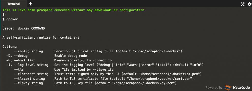 An example of Katacoda’s embedded terminal, accessible in-browser.