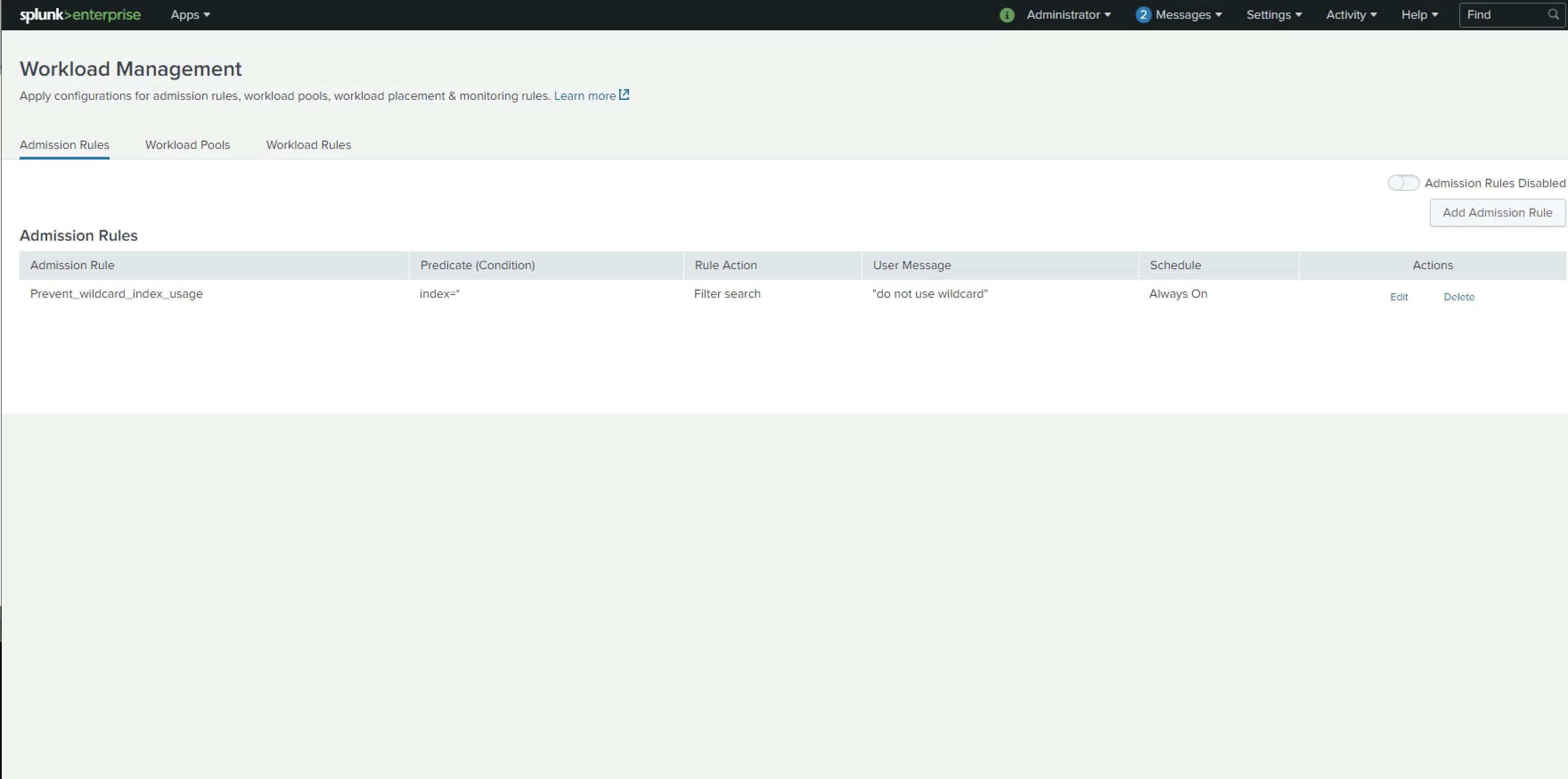 Workload management, the management of workloads on a Splunk platform has already been introduced before. However, in this release Splunk now also added admission rules. These rules support in the management of workloads depending on business needs. For instance, very often in practice, Splunk users, which have discovered the wildcard trick, define index=* coupled with some search terms in their query in order to find their data.