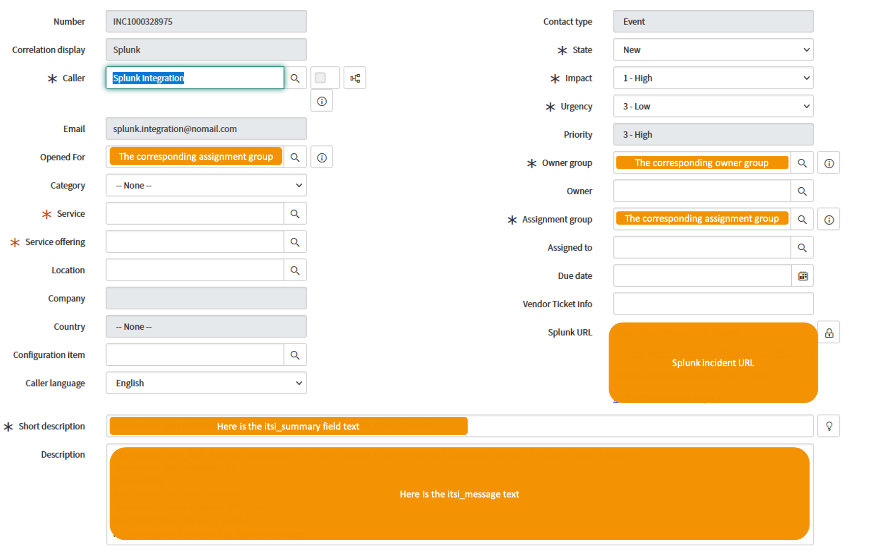 Voor de integratie naar ServiceNow wordt een standaardoplossing binnen ITSI aangeboden, zie hiervoor de Splunk Docs - ITSI SNOW. In ons voorbeeld is in 1 van de besproken velden, de itsi_tag aangegeven om de integratie naar ServiceNow te starten. Vanuit Splunk ITSI wordt middels een XML/SOAP call een incident in ServiceNow aangemaakt en/of voorzien van een nieuwe status. De integratie tussen Splunk en ServiceNow werkt bidirectioneel. Indien in ServiceNow dus een update wordt doorgevoerd, wordt deze ook naar Splunk verzonden en vice versa.