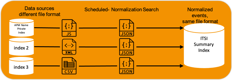 Belangrijk hierbij is dus dat de key-value indeling door normalisatie hetzelfde wordt. Als voorbeeld: waar in de APM Name Private index links in de afbeelding weergegeven, een veld als responstijd wordt aangeduid met de key-value combinatie performance=value, zal in index 2 dat veld bijvoorbeeld timer=value zijn en in index 3 responsetime=value. Door normalisatie kan dat voor alle drie de databronnen eenduidig aangepast worden naar itsi_duration=value.