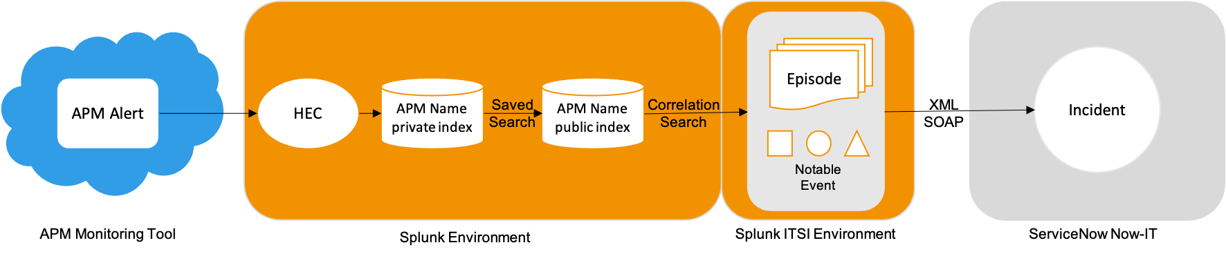 | eval itsi_business_service=business_serviceTijdens de normalisatie is het event middels het collect commando verstuurd naar de apmname_alerts_itsi_public summary index. Vanuit deze public index wordt door een correlation search de events opgenomen door Splunk ITSI. Dit is een standaard functionaliteit binnen Splunk ITSI en kan gezien worden als een macro die een index scant op nieuwe events en de integratie naar Splunk ITSI start. Eenmaal in Splunk ITSI komen de events binnen als “notable event”. Een notable event kan gezien worden als een losstaand alert. Wanneer een alert weer een positieve status heeft, bijvoorbeeld inloggen applicatie was onbeschikbaar en nu weer beschikbaar, wordt het event afgesloten en toegevoegd als Episode. Op zowel de losstaande notable events als de episodes worden correlatie zoekopdrachten gedaan en kunnen incidenten gestart worden. Deze correlaties binnen een databron als tussen databronnen toont de kracht van ITSI.