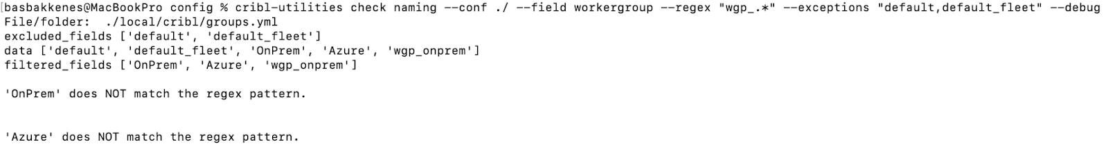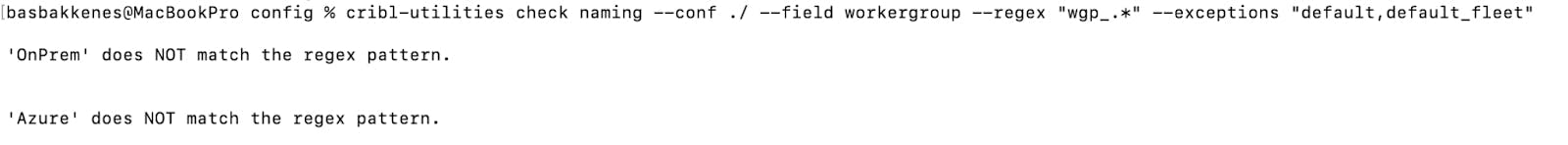 cribl-utilities check naming --conf /opt/cribl --field pipelines --regex "ppl_.*"In this example there are four worker groups created. Only one applies to the new naming convention. Which states that the name of a worker group should start with "wgp_".