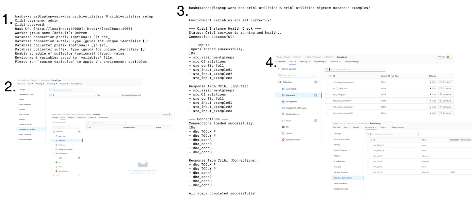 Above is a picture shown with a couple of steps. In step 1 the setup of CriblUtilities is started. A few required parameters are asked from the user via the prompt, this results in a ".env" file. Alternatively, you can also set this file manually. In step 2 the empty screens are shown to prove the environment is empty. In step 3 the actual migration is done. The script gives insight into what is done. In step 4 the proof is shown that the database connections and collectors are created in Cribl Stream.