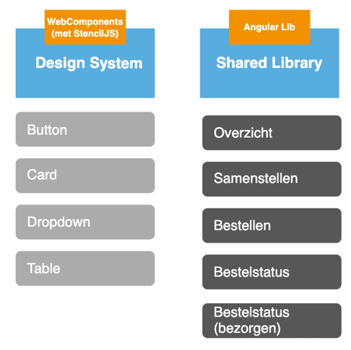 De blauwe blokken zijn nog steeds de applicaties en de oranje blokken beschrijven op welke manier. Binnen deze applicaties wordt gebruik gemaakt van de donkergrijze blokken, wat dus gedeelde functionaliteiten zijn die op hun beurt weer gebruik maken van het Design System. De lichtgrijze blokken zijn ook functionaliteiten, maar binnen de applicatie zelf. Ook deze componenten maken weer gebruik van het Design System.