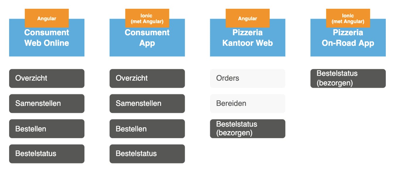 Naast de applicaties zullen er ook vier backend services nodig zijn, zie de afbeelding: