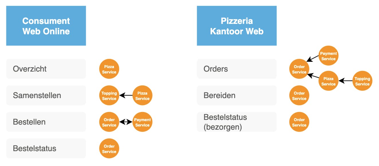 Sommige functionaliteiten maken gebruik van meerdere services, maar er is vanuit de functionaliteit gezien altijd maar één ingang/startpunt. Voor de functionaliteit “overzicht” zal enkel de “pizza service” benaderd worden, eveneens voor de functionaliteit “samenstellen” welke de “topping service” gebruikt. Bij de functionaliteit “bestellen” wordt het al een stuk interessanter. Om de pizza’s te kunnen bestellen zal dit via de “order service” verlopen. Omdat je natuurlijk eerst moet betalen, zal er vanuit de “order service” een beroep gedaan worden op de “payment service” zodat de betaling gedaan en geverifieerd kan worden. De functionaliteit “bestelstatus” zal via de “order service” verlopen.