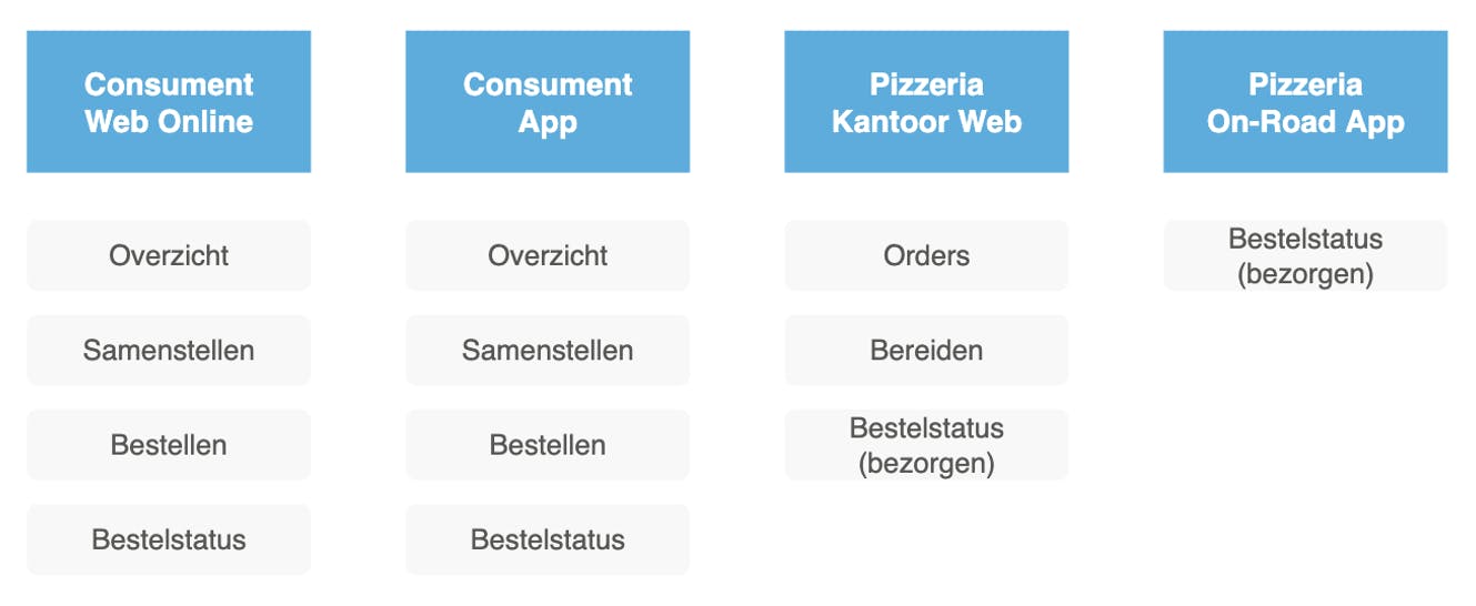 Op basis van deze wensen kom je tot een landschap van vier applicaties (de blauwe blokken) met overeenkomende functionaliteiten (de grijze blokken), zie de afbeelding:
