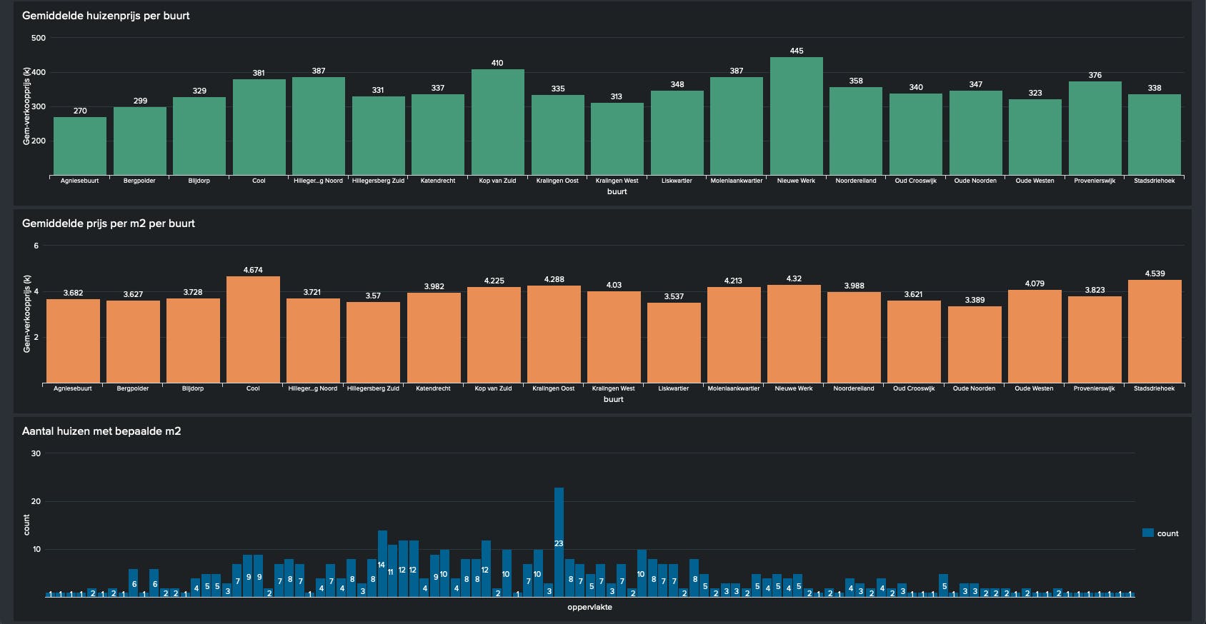 Uiteindelijk heb ik mijn eigen monitoring dashboards gemaakt in Splunk, die mij net meer diepgang en inzicht kunnen geven in de Rotterdamse woningmarkt. Het is een ongoing project en graag presenteer ik in dit blog wat eerste resultaten. Daarna zal ik op bepaalde technische aspecten wat dieper ingaan. Qua data is alleen een geselecteerd aantal buurten en prijsklasse opgenomen die ik mogelijk interessant vond.