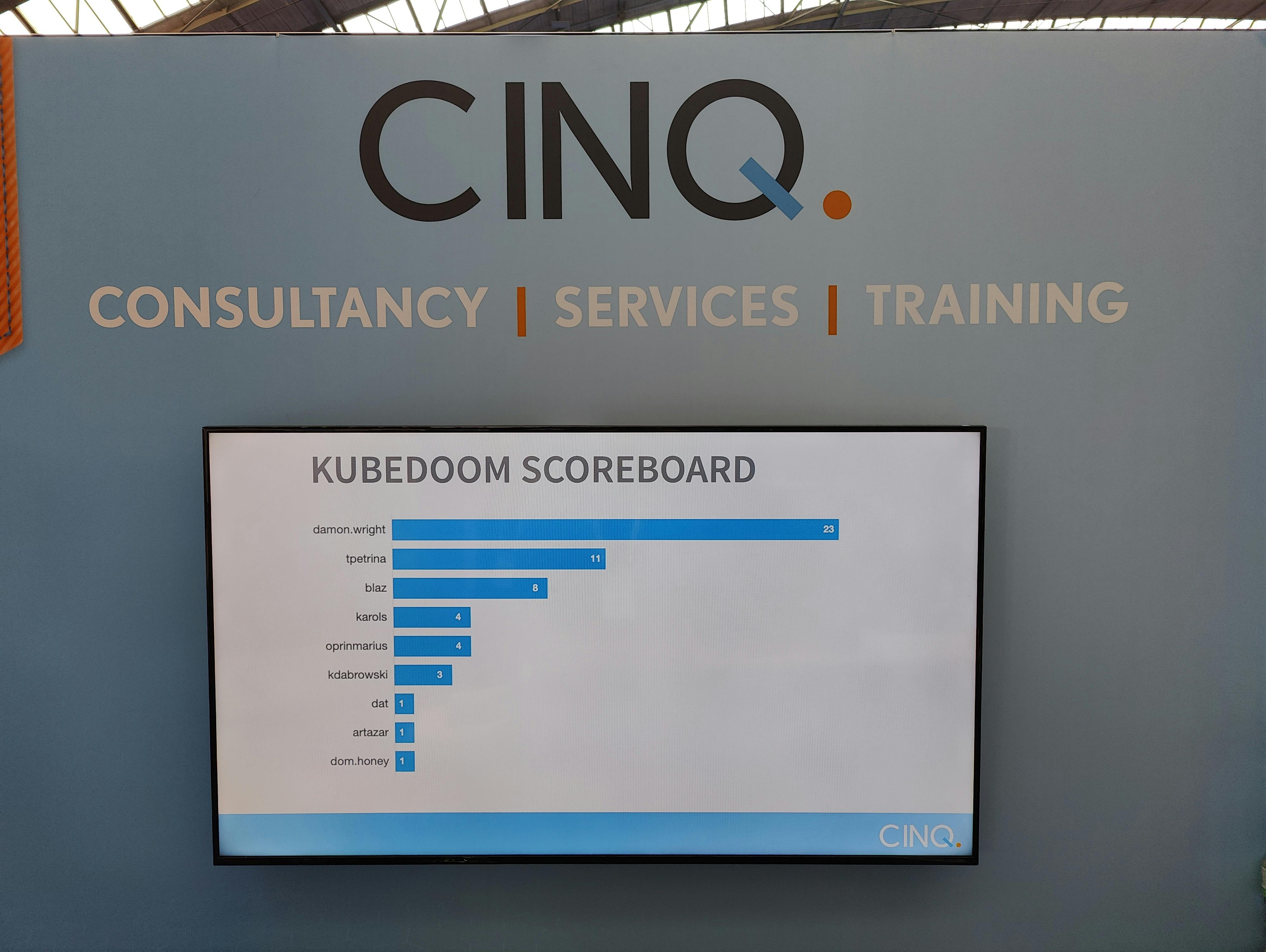 Vandaag was er één echte uitblinker in KubeDoom. Damon Wright zette in de loop van de ochtend een dikke score neer van 23 punten, en daar kwam vervolgens niemand meer bij in de buurt. Hij had de deployment zo snel gerepareerd, dat hij vervolgens veel tijd had in het spel om de monsters (pods) te pakken te krijgen. De monsters spawnen in verschillende ruimtes in de map en Damon had ook nog eens de mazzel dat er veel monsters tegelijk in dezelfde ruimte terecht kwamen.