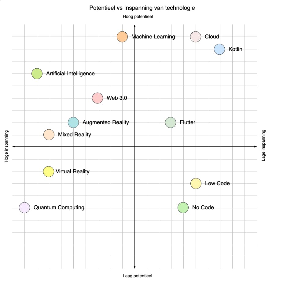Potentieel: Bij potentieel gaat het niet alleen het potentieel van de techniek in de hele markt maar ook impact op CINQ en zijn klanten. Voorbeeld: Quantum Computing heeft het potentieel de hele IT mark te veranderen. Echter voor de diensten die wij leveren is het aannemelijk dat Quantum Programming voorlopig nog niet aan de orde is. Hierdoor is de potentie laag.