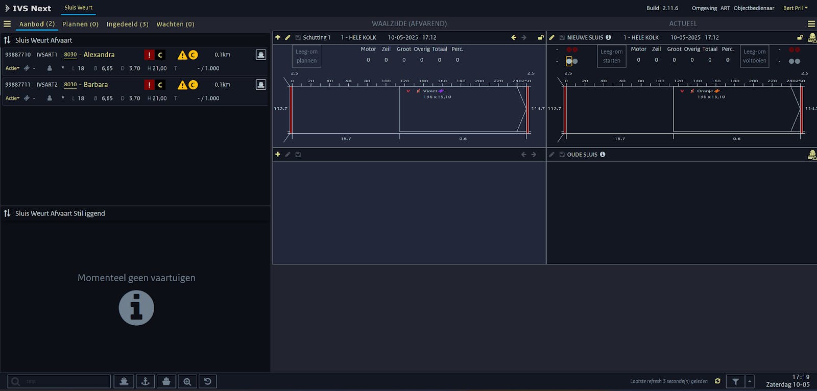 IVS Next is een geavanceerd informatiesysteem dat vaarwegbeheerders (sluis- en brugbedienaars en/of verkeersleiders) een actueel overzicht biedt van scheepvaartverkeer op de Nederlandse waterwegen. Het systeem, operationeel sinds 2019, verzamelt gegevens via onder andere AIS-signalen* en aanmeldingen vanuit BICS. Hierdoor kunnen schepen real-time worden gevolgd en wordt de doorstroming geoptimaliseerd.