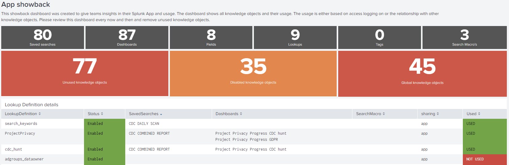 Per knowledge object wordt in kaart gebracht of deze relaties heeft met andere objecten en zo ja, welke dan. Op die manier hoef je nooit meer bang te zijn dat je een object verwijderd die stiekem toch nog ergens gebruikt werd. Maar je hoeft ook zeker geen objecten te laten staan omdat men niet meer weet of deze nog gebruikt worden. Met behulp van dit dashboard, kun je precies zien wat je wel en niet kunt verwijderen. Als je ongebruikte searches, lookups en andere objecten verwijderd, verbeter je de performance van de Splunk omgeving - en houd je de boel lekker schoon!