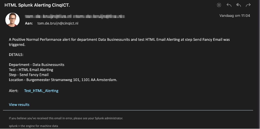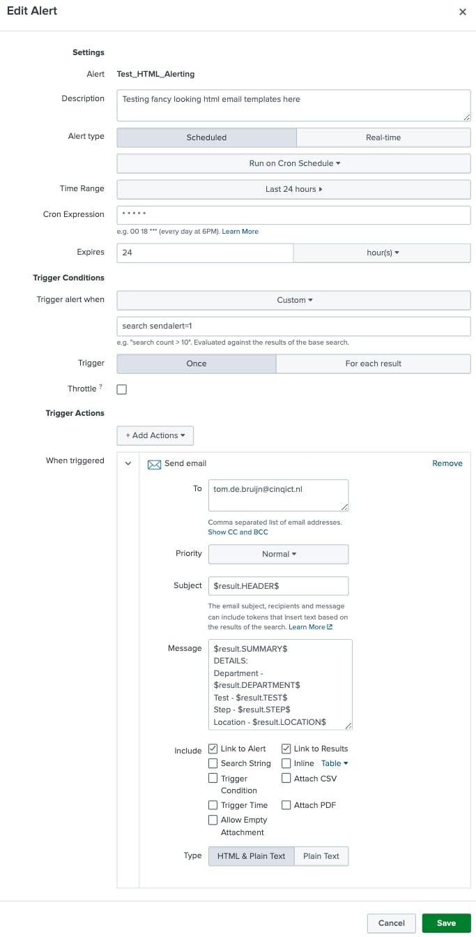 What we have now created is an alert that runs via CRON schedule once a minute, and triggers when sendalert=1 is set. Once triggered it sends an email to tom.de.bruijn@cinqict.nl. Then as a subject the field HEADER is used by calling $result.fieldname$. In the message section several fields are used to compose the email body.