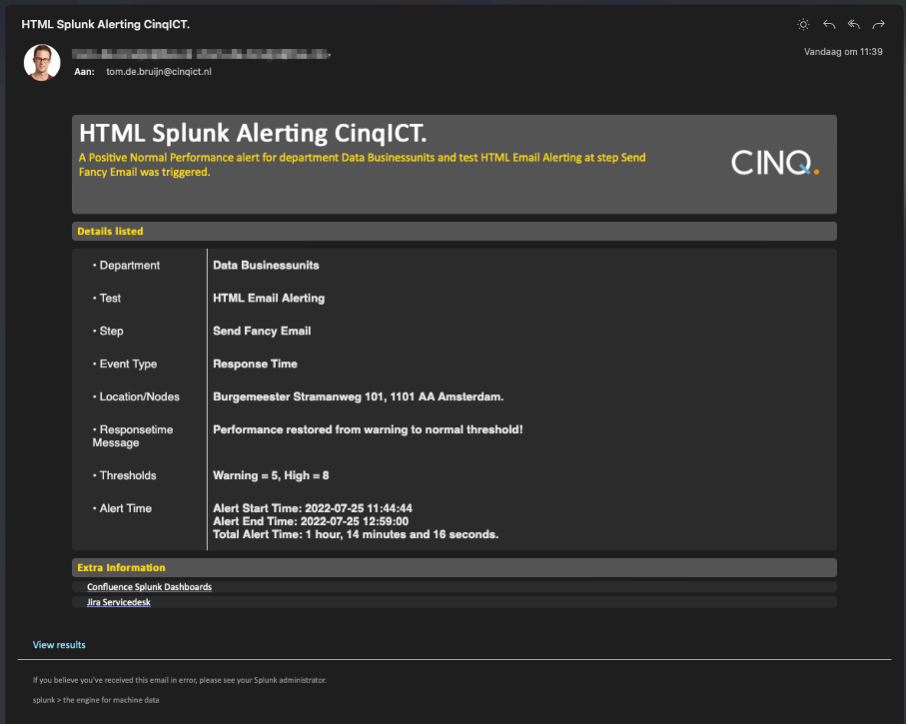 We can start testing the alert with changing sendalert=0 to sendalert=1 in the alert search again, and off course save it once more. Once a minute has past, an alert will be sent and the HTML in your search will be transformed to HTML in your email Template.