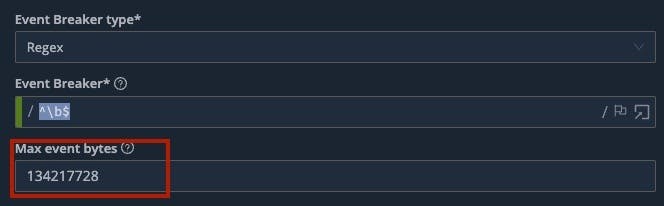 So choose a value that’s the size of the file in bytes, or go all the way up to the maximum number of bytes an event can be for Cribl to handle (134217728 bytes).