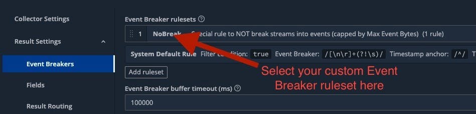 Find the Event Breaker Rules (under Processing > Knowledge). Either create a new Ruleset, or make a copy of the existing Ruleset “Cribl - Do Not Break Ruleset”. What we’re interested in is to adjust the Max event bytes size so the XML file in its entirety will be sent to the pipeline for processing.