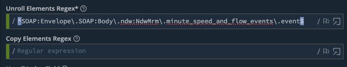 SOAP:Envelope\SOAP:Body\ndw:NdwMrm\minute_speed_and_flow_events\eventThis is exactly what we’ll be using in the function XML Unroll. Well, we need to change it a little bit because we need to put a Regex expression in the function which describes the path to the array to unroll:
